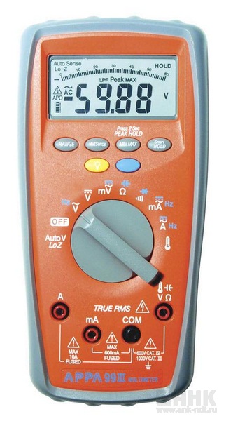 • Максимальное разрешение (APPA 99III): 0,1 мВ / 0,01 мА / 0,1 Ом / 0,1 Гц / 1 нФ / 0,1 °С