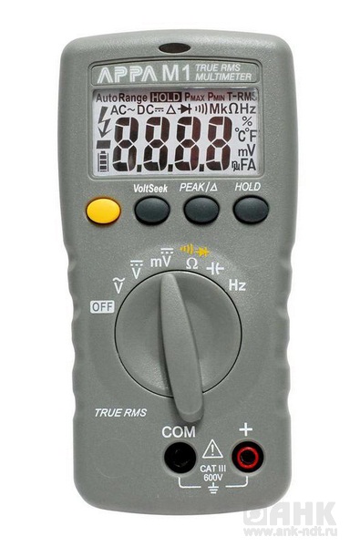 Мультиметр цифровой TrueRMS (измерение сигнала произвольной формы). Базовая погрешность ± 0,5% (DCV), U пост. / перем. до 600 В (разр. от  0,1 мВ). Измерение сопротивления до 40 МОм (разр. от 0,1Ом), ёмкости до 1000 мкФ (разр. от 0,01 нФ), частоты до 100 кГц (разр. 1 Гц), коэф. заполнения импульсов 0,1…99,9%, прозвонка цепи, тест диодов. Функциональность: бесконтактный индикатор напряжения (VoltSeek), автоматический выбор пределов, регистрация пиковых значений, удержание показаний. ЖК-дисплей 4 разряда (6000), 1,5 изм./с, питание 1,5 В х 2, масса 300 г.