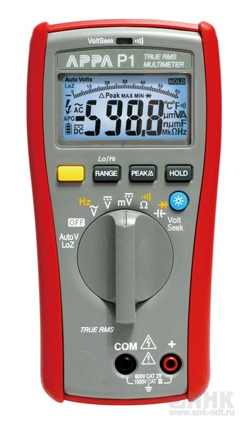 • Измерение переменного (АСV) и постоянного напряжения (DCV) до 600В, частоты, емкости, сопротивления до 40 МОм, испытание p-n переходов, проверка целостности цепи (прозвонка со звуковой и световой сигнализацией);