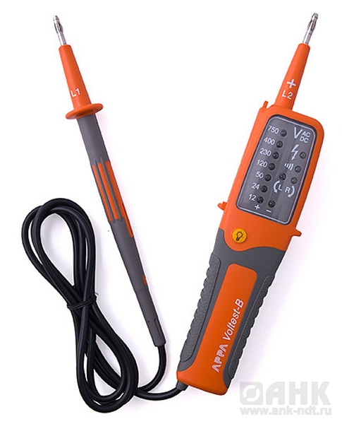 Пробник-тестер напряжения (пост./перем - автовыбор): 12/ 24/ 50/ 120/ 230/ 400/ 750 В (св.диод. шкала), рабочий диапазон 50…60 Гц; прозвон цепи 0…600 кОм, тест УЗО (0,2 Апик; преднамеренное размыкание); индикация полярности напряжения (DC); индикация фазного напряжения в 1ф сети и направления чередования фаз; с/д подсветка зоны измерения; автовключение (> 12В) и автовыключение питания, режим самодиагностики, исполнение IP65, питание 1,5 В×2 (тип ААА); 52×239×29 мм; масса 220 г