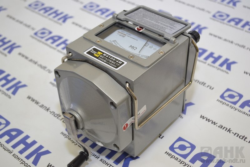 Мегаомметр ПрофКиП М4100/4М  (измеритель сопротивления изоляции ПрофКиП М4100/4М) предназначен для измерения сопротивления изоляции электрических цепей, не находящихся под напряжением. Мегаомметр ПрофКиП М4100/4М применяются для измерения сопротивления изоляции электрической проводов, кабелей, разъёмов, трансформаторов, обмоток электрических машин и других устройств, а также для измерения поверхностных и объемных сопротивлений изоляционных материалов.  Питание мегаомметра ПрофКиП М4100/4М осуществляется от встроенного электромеханического генератора.