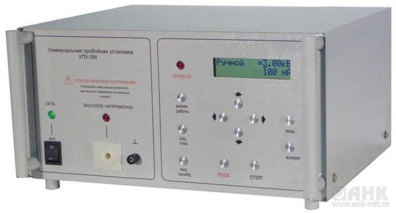 Универсальная пробойная установка УПУ-5М представляет собой прибор для измерения электрической прочности изоляции при испытании постоянным или переменным напряжением. УПУ-5М прибор настольного исполнения. Установка УПУ-5М выпускается в двух вариантах исполнения: — универсальный (У) с возможностью испытания как переменным так и постоянным напряжением — переменный (П) с возможностью испытания только переменным напряжением. Второй вариант имеет больший ресурс.