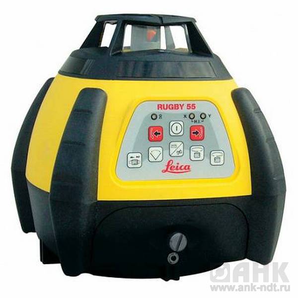 Rugby 55 с приемником создает вращающися лазерный луч до 150 метров а значит достаточно одной установки прибора для нивелировки как внутри помещений, так и на строительных площадках малого и среднего размеров.Выполнять или менять установки лазерного нивелира Leica Rugby 55 можно осуществлять с помощью инфракрасного пульта дистанционного управления, кнопки которого полностью соответствуют кнопкам на панели прибора.
