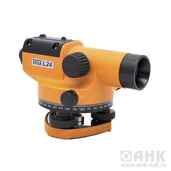 Нивелир оснащён лимбом для измерения горизонтальных углов с градуировкой на 360° и интервалом в 1°. Для дополнительного удобства корпус устройства выполнен в ярко оранжевом цвете. Оптический нивелир Vega L24 отличается компактностью и малым весом в 1,2 кг.