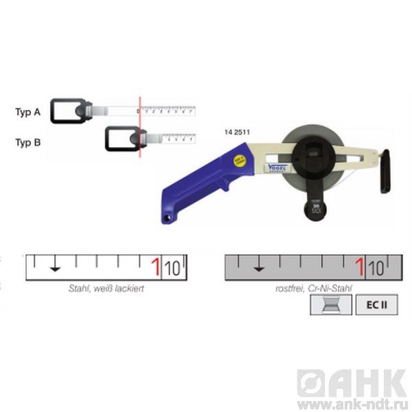 Мерная лента Vogel на алюминиевой раме с рукояткой от 20 до 50 м на алюминиевой раме с рукояткой и стальной или нержавеющей лентой, предназначена для измерения различных величин.