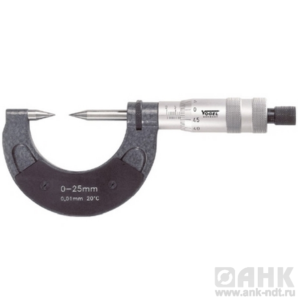 Микрометры Vogel гладкие с острыми колками диапазон измерений от 0-25х0,01 мм до 75-100х0,01 мм, колки 30 или 60 градусов, предназначены для высокоточного определения линейных размеров. Измерение производится абсолютным или относительным контактным способом, при этом основным преимуществом инструмента является низкая погрешность, которая колеблется в промежутке значений от 2 до 50 мкм и зависит от класса точности микрометра, а также от измеряемого диапазона. В качестве преобразовательного механизма выступает так называемая микропара – винт и гайка.