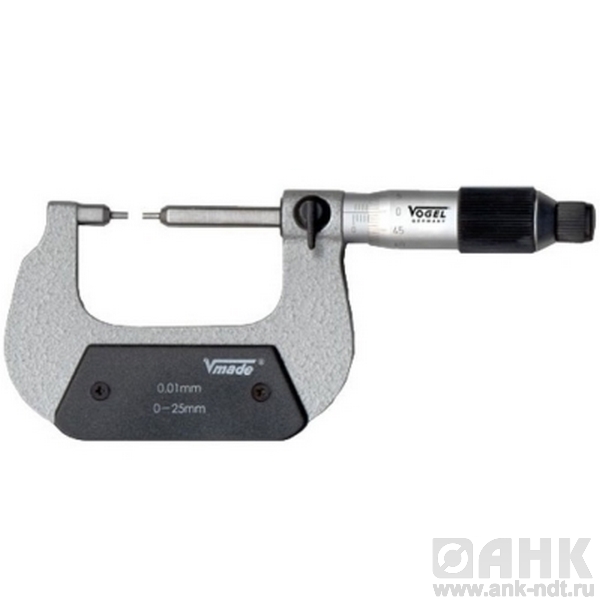 Микрометры Vogel гладкие со ступенчатыми колками диапазон измерений от 0-25х0,01 мм до 75-100х0,01 мм, длина ступени 5 мм, для простых измерений, предназначены для высокоточного определения линейных размеров. Измерение производится абсолютным или относительным контактным способом. Основным преимуществом инструмента является низкая погрешность, которая колеблется в промежутке значений от 2 до 50 мкм и зависит от класса точности микрометра, а также от измеряемого диапазона. В качестве преобразовательного механизма выступает так называемая микропара – винт и гайка.