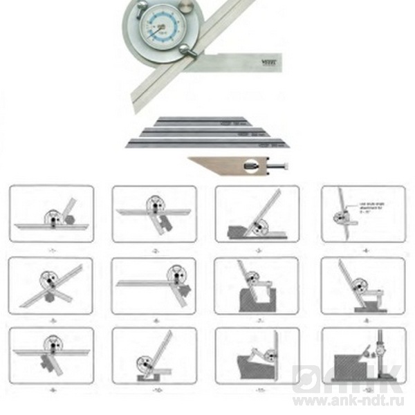Угломер Vogel со круглой шкалой, планки  150/200/300 мм, диапазон измерения 4х90°, цена деления 5", предназначен для измерения геометрических углов между поверхностями, в деталях и изделиях, в составе различных конструкций (контактным способом), а также между объектами, удаленными друг от друга (оптическим способом). Измерение может осуществляться: