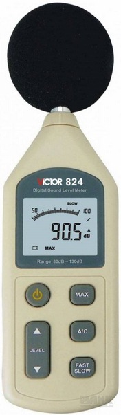 Это цифровой шумомер Victor 824 специально разработан для инженеров по технике безопасности, служб техники безопасности, служб санитарного надзора, для оценки шумовой обстановки в окружающей среде на производстве, в офисе, на транспорте, дома, а также для оценки аудиосистем в диапазоне от 30 до 130 дБ.