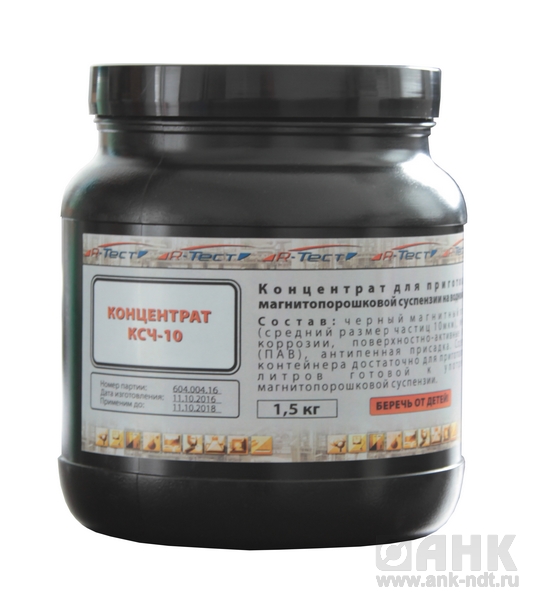Сухой концентрат КСЧ-10 предназначен для быстрого приготовления черной магнитопорошковой суспензии на водной основе. В состав концентрата входят все необходимые добавки для предотвращения образования пены при перемешивании и коррозии на деталях. Для приготовления суспензии требуется только вода.