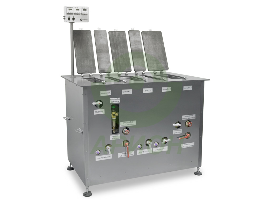 Установка снабжена фильтром очистки водопроводной воды, циркуляционным насосом для перемешивания проявителя, пультом управления с тремя таймерами для контроля времени проявления и фиксации.