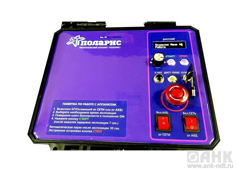 Компактный и малогабаритный аппарат, с  проникающей способностью по стали до 75мм. Данный аппарат можно использовать в полевых условиях, идеально подходит для контроля сварных соединений технологических трубопроводов и работе в цеховых условиях. В пульт управления встроен источник питания который позволяет работать автономно без сети. На панели управления расположен индикатор-вольтметр который  позволяет следить за количеством заряда/разряда батареи.