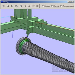Автоматизированная система работает под управлением программы AsnkView, позволяющей: создавать или использовать ранее созданную модель вала, производить настройку УЗ канала дефектоскопа УМД-100, отображать 3D модель вала в процессе контроля в твердотельном и полупрозрачном виде с координатной сеткой и без нее, строить осевое сечение модели вала для получения чертежа, отображать УЗ сигналы в виде А, В и С-сканов, полностью документировать процесс контроля и вести базы данных результатов.