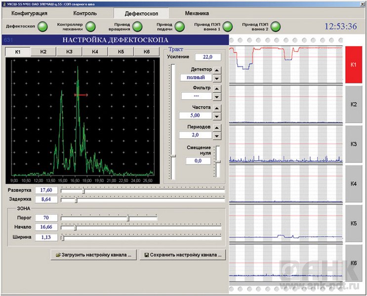 Информация от измерительной части поступает в реальном времени на управляющую ЭВМ и выводится на экран. Программное обеспечение, работающее под управлением операционной системы Windows, выполняет задачи отображения и регистрации результатов контроля измерительной части установки, ведёт электронный журнал работы установки, а так же сохраняет на жесткий диск результаты УЗ контроля в виде протоколов для дальнейшего просмотра и вывода на печать.