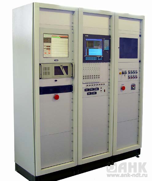 Установка представляет собой универсальный модульный дефектоскоп/толщиномер с независимыми параллельными каналами, построенный на принципиально новой высокоскоростной архитектуре канала. Оставив от предшественника принцип построения системы, новая УПНК v2.0 построена на использовании двух высокопроизводительных промышленных компьютеров с панельными ЖКИ мониторами -один для ввода сигналов в реальном времени, второй -для общего управления системой, архивирования данных, связи с другими устройствами общезаводской компьютерной сети. Конструктив установки состоит из двух промышленных 19" шкафов Rittal, с установленным - многоканальным дефектоскопом, блоком питания, промышленным блоком бесперебойного питания, 2-х промышленных компьютеров с панельными ЖКИ мониторами и принтером. Третий промышленный шкаф - предназначен для установки системы автоматизированного управления приводами и устройствами механизации процесса контроля (в т.ч. устройствами загрузки/ выгрузки изделий)