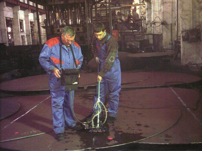 Установка полуавтоматизированного ультразвукового контроля предназначена для дефектоскопии сварных швов в цеховых условиях. Применяется также для перепроверки результатов АУЗК. ПАУЗК сварных швов проводится со скоростью сканирования до 1 м/мин. При проведении контроля происходит оценка характера и параметров выявляемых дефектов. На каждом миллиметре сварного шва происходит слежение за акустическим контактом. Полученные результаты контроля записываются в память дефектоскопа.