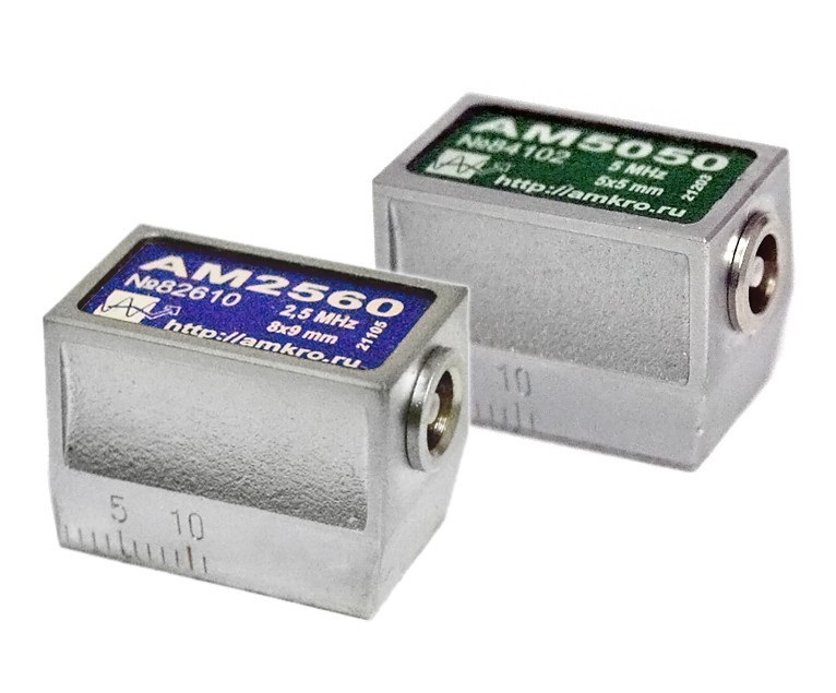 Миниатюрные наклонные совмещённые преобразователи предназначены для контроля труднодоступных мест изделий. Имеют малые габариты корпуса и различные размеры пьезоэлементов.
