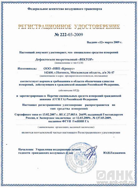 Вихретоковый дефектоскоп ВЕКТОР сертифицирован Федеральным Агенством по Техническому Регулированию и Контролю  и зарегистрирован в Государственном реестре средств измерений под №33845-12.