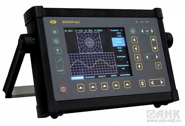 Вихретоковый дефектоскоп ВЕКТОР версии 60Д с поддержкой динамических (роторных) преобразователей. Дефектоскоп предназначен для контроля металлопродукции на наличие дефектов типа поверхностных и подповерхностных трещин, нарушений сплошности и однородности материалов, полуфабрикатов и готовых изделий из ферромагнитных  и неферромагнитных сталей, цветных металлов и их сплавов, углепластиков  и пр. Дефектоскоп может использоваться для измерения толщины защитных покрытий, глубины поверхностных трещин, электропроводности цветных металлов и содержания ферритной фазы в нержавеющих хромоникелевых сталях аустенитного и перлитного классов.