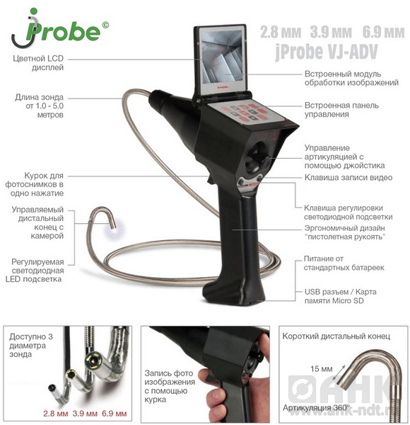 Промышленный видеоэндоскоп jProbe VJ-ADV предназначен для осмотра труднодоступных полостей машин, оборудования и трубопроводов с помощью высококачественных зондов, которые позволяют осуществлять дистанционную артикуляцию камерой по всем 4-м направлениям (вверх, вниз, влево, вправо).